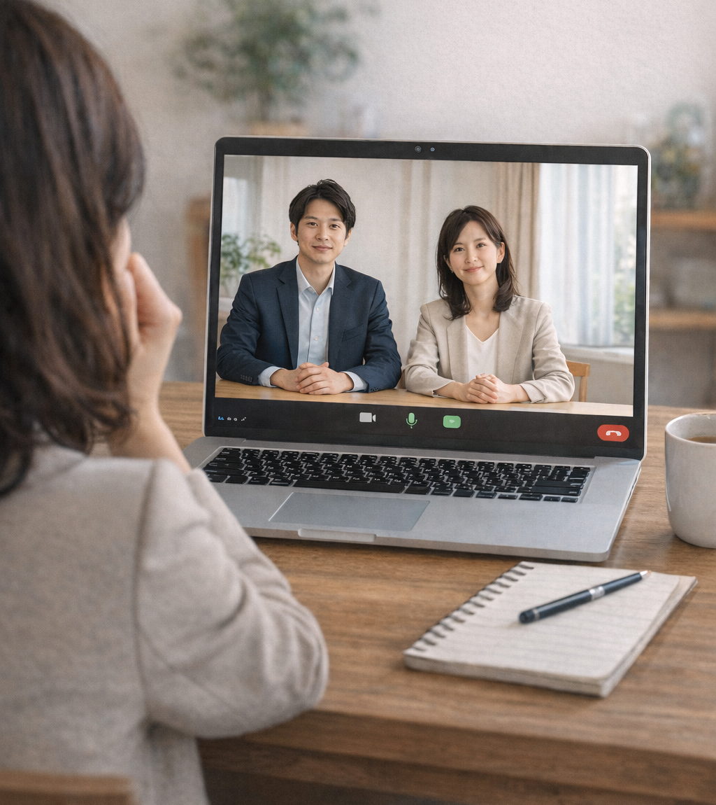 面接が始まり、画面越しには採用担当の方が2人、会議室に並んで座っていました。